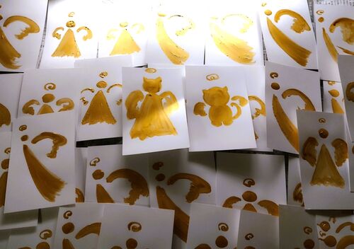 捕獲とお届けが一段落して、 お世話になった方々に送るカードを作ってみました。 ずっと以前に購入していた金箔と金粉を使って、黄金の天使を描いてみました。 絵は下手ですが、金は価値あるかな? 今は金が高騰していて手が出せません! 私の天使イメージは…